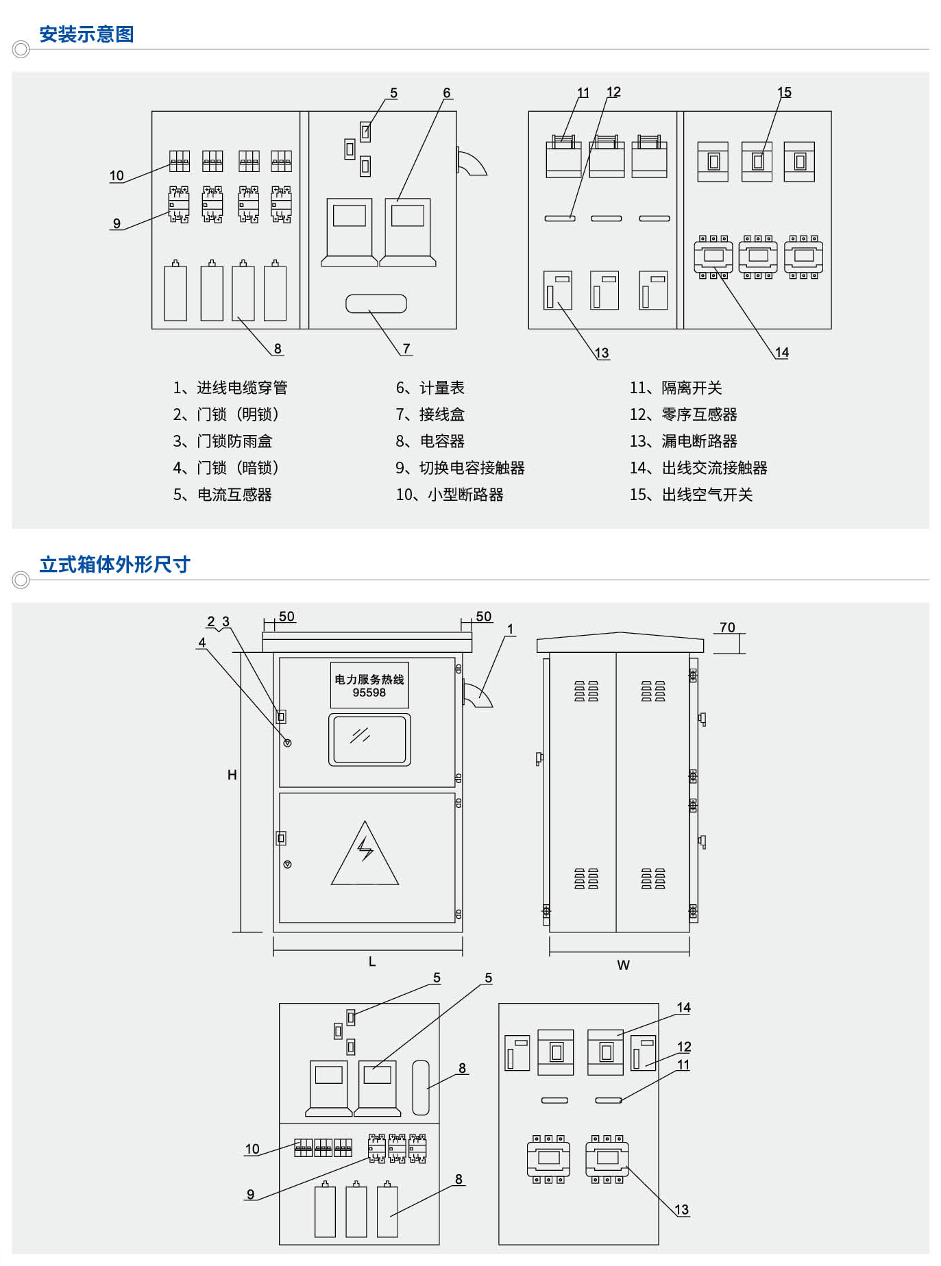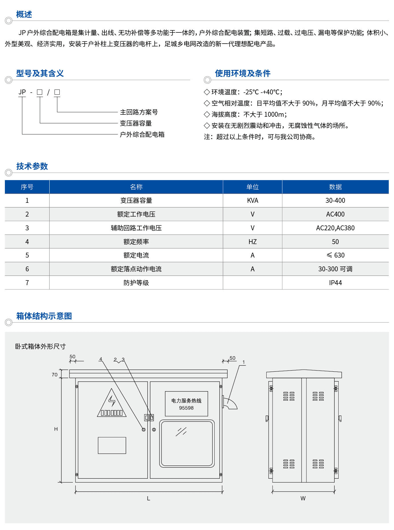 JP戶外綜合配電箱是集計(jì)量、出線、無功補(bǔ)償?shù)榷喙δ苡谝惑w的,戶外綜合配電裝置;集短路、過載、過電壓、漏電等保護(hù)功能;體積小、外型美觀、經(jīng)濟(jì)實(shí)用,安裝于戶補(bǔ)柱上變壓器的電桿上,足城鄉(xiāng)電網(wǎng)改造的新一代理想配電產(chǎn)品。